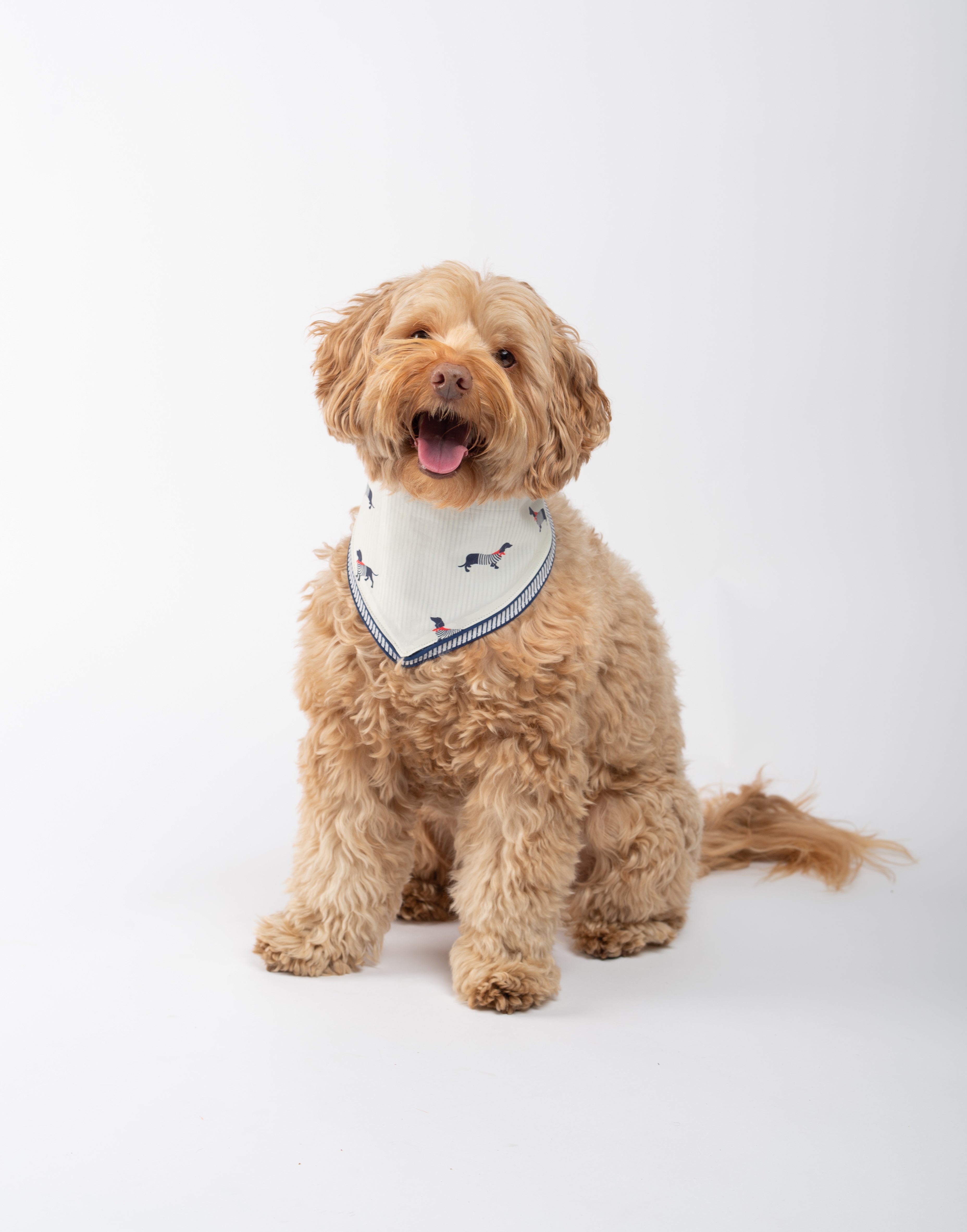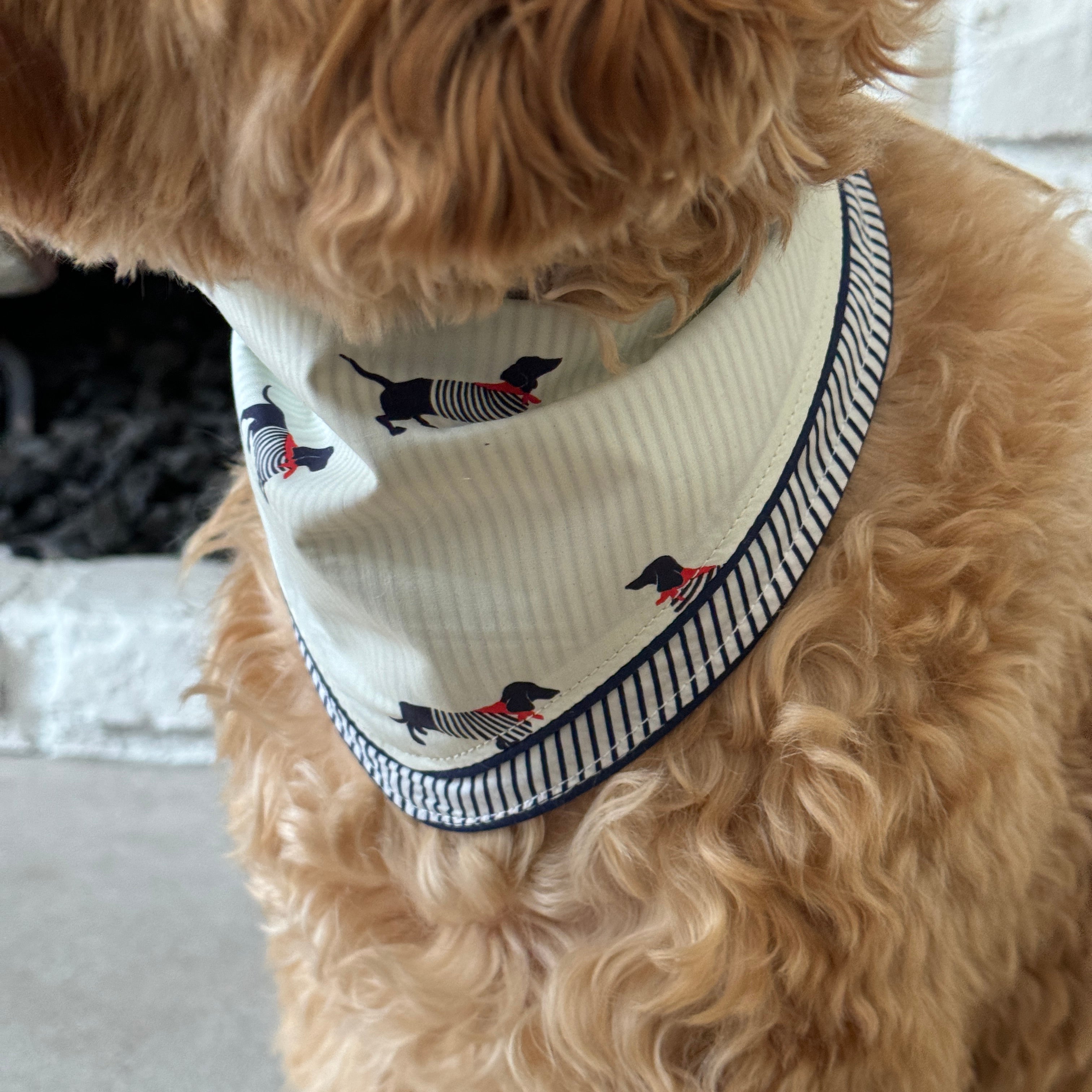 This 100% cotton poplin fabric features a Dachshung with a beret and scarf (of course!). Backed in a cotton blue and white pinstripe and trimmed with navy piping.
