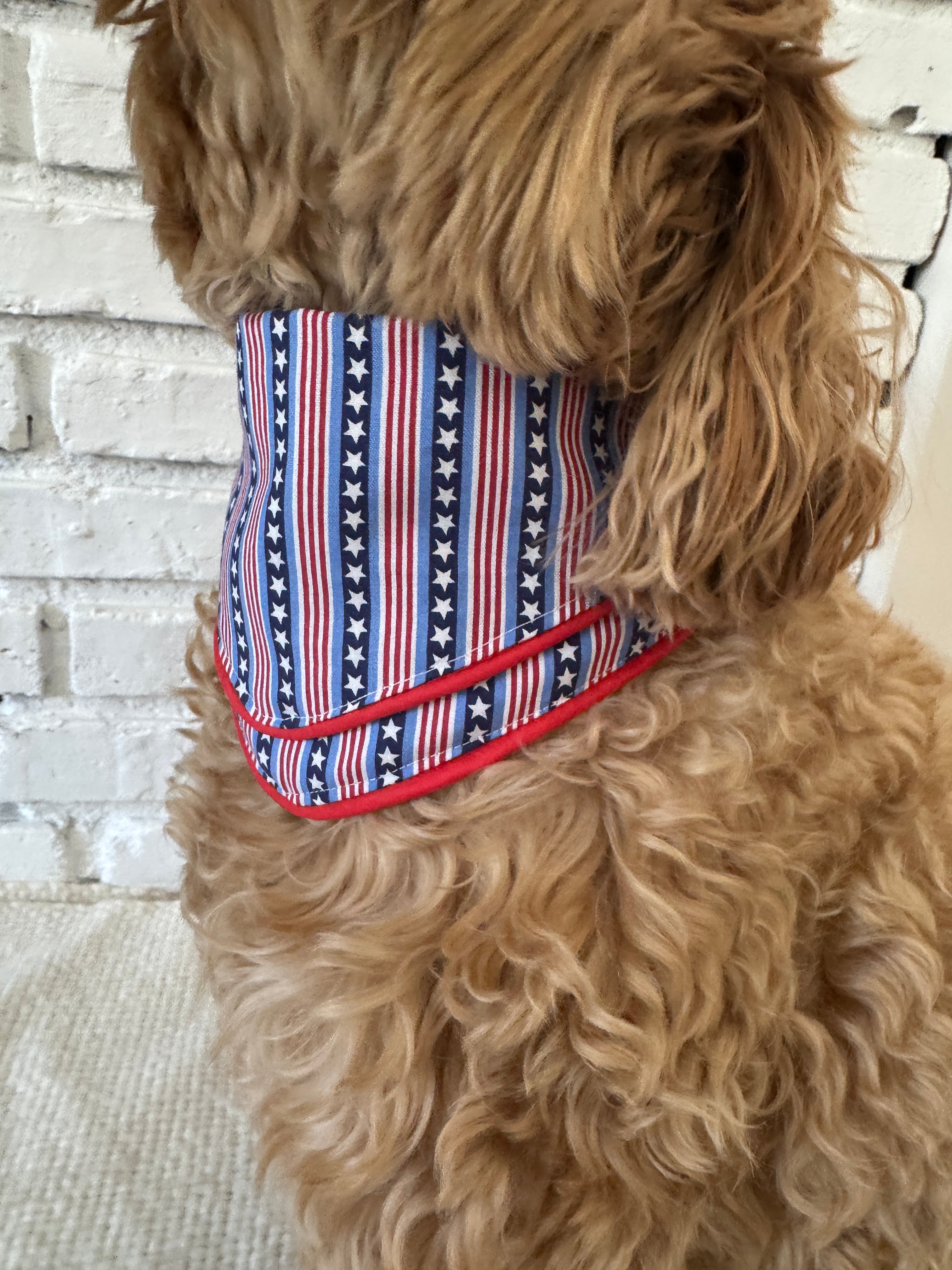 The stars and stripes print of this cotton fabric evokes patriotic buntings hung for the 4th of July. Made of a lightweight cotton poplin, this scarf is perfect for pup parties on the beach.