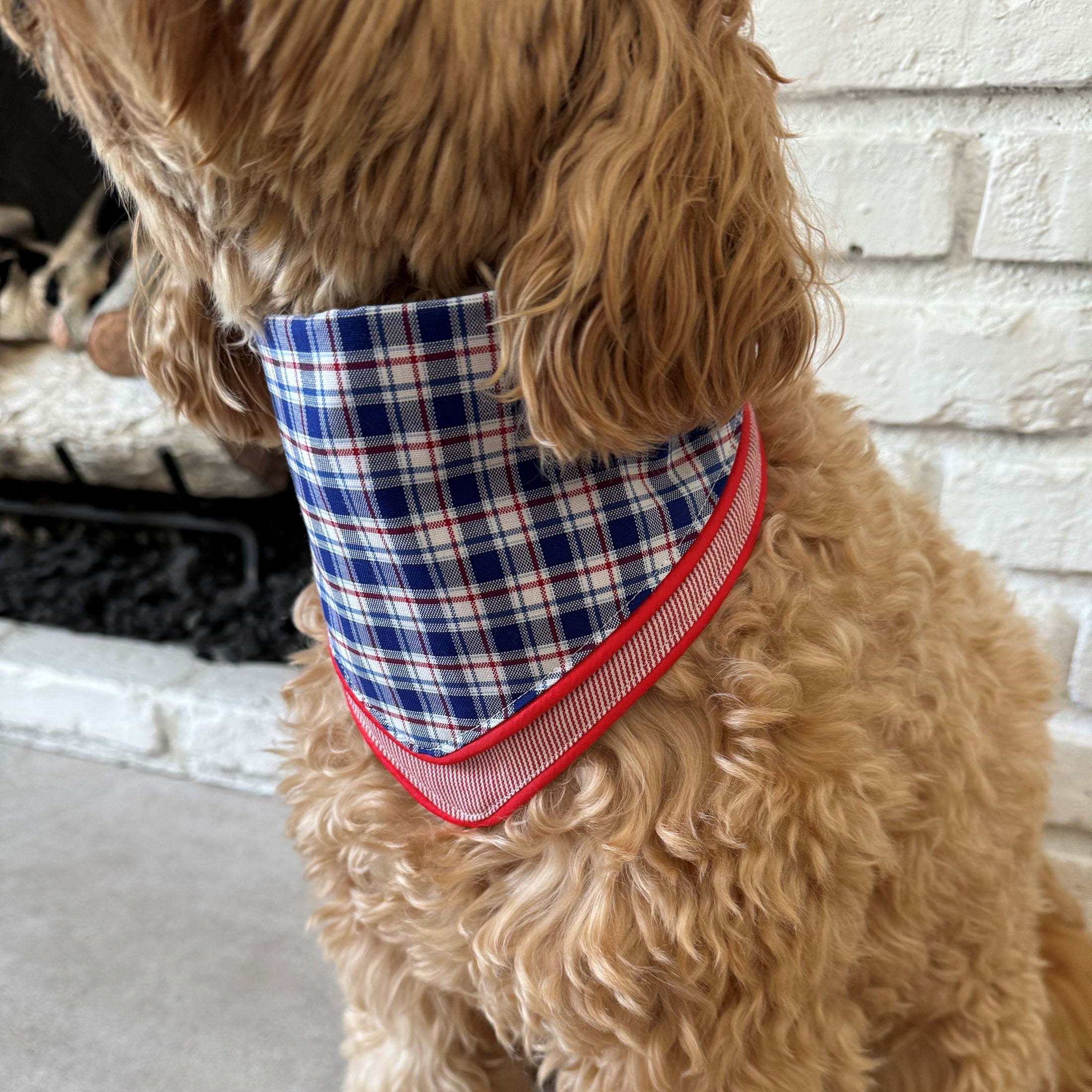 Cheer on your favorite team in style with this blue and red plaid style. Made of fine cotton oxford, your furry fan will steal the show! Like all Goldsnap layered scarves, this one is reversible for a simpler red and white striped look.