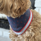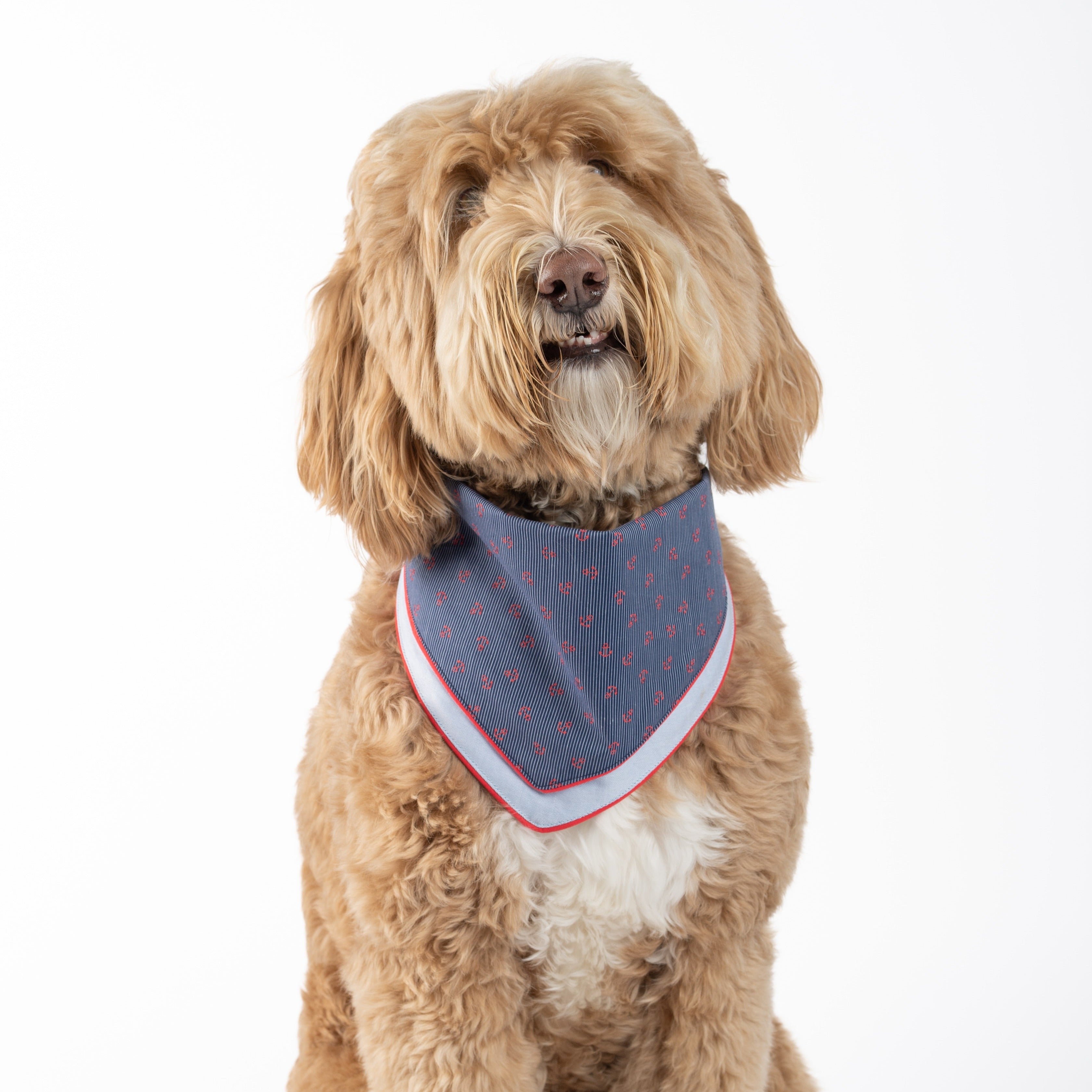 Your Goldsnap first mate is ready to set sail in this adorable 100% cotton anchor print shirting fabric. Backed with blue oxford and trimmed in red piping.