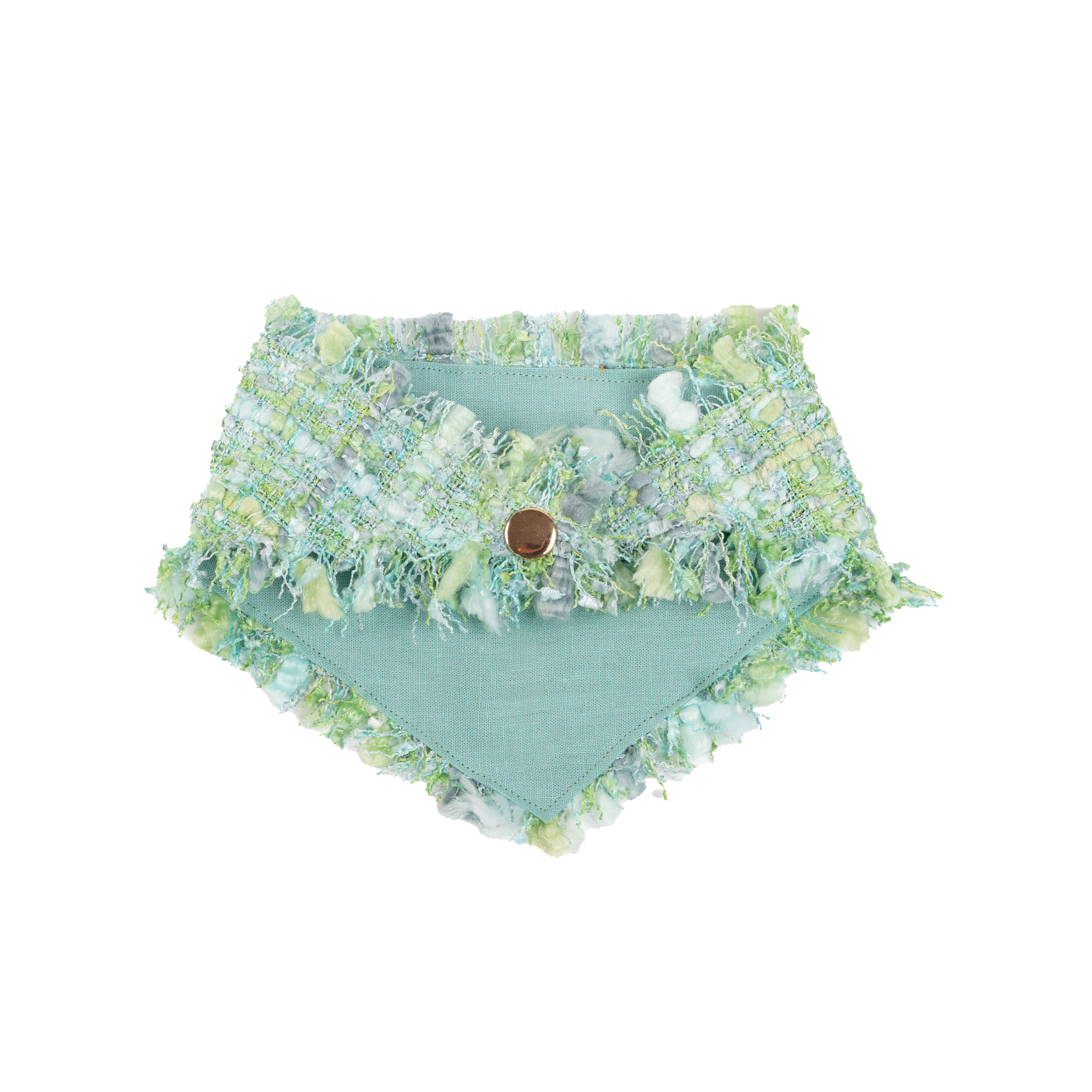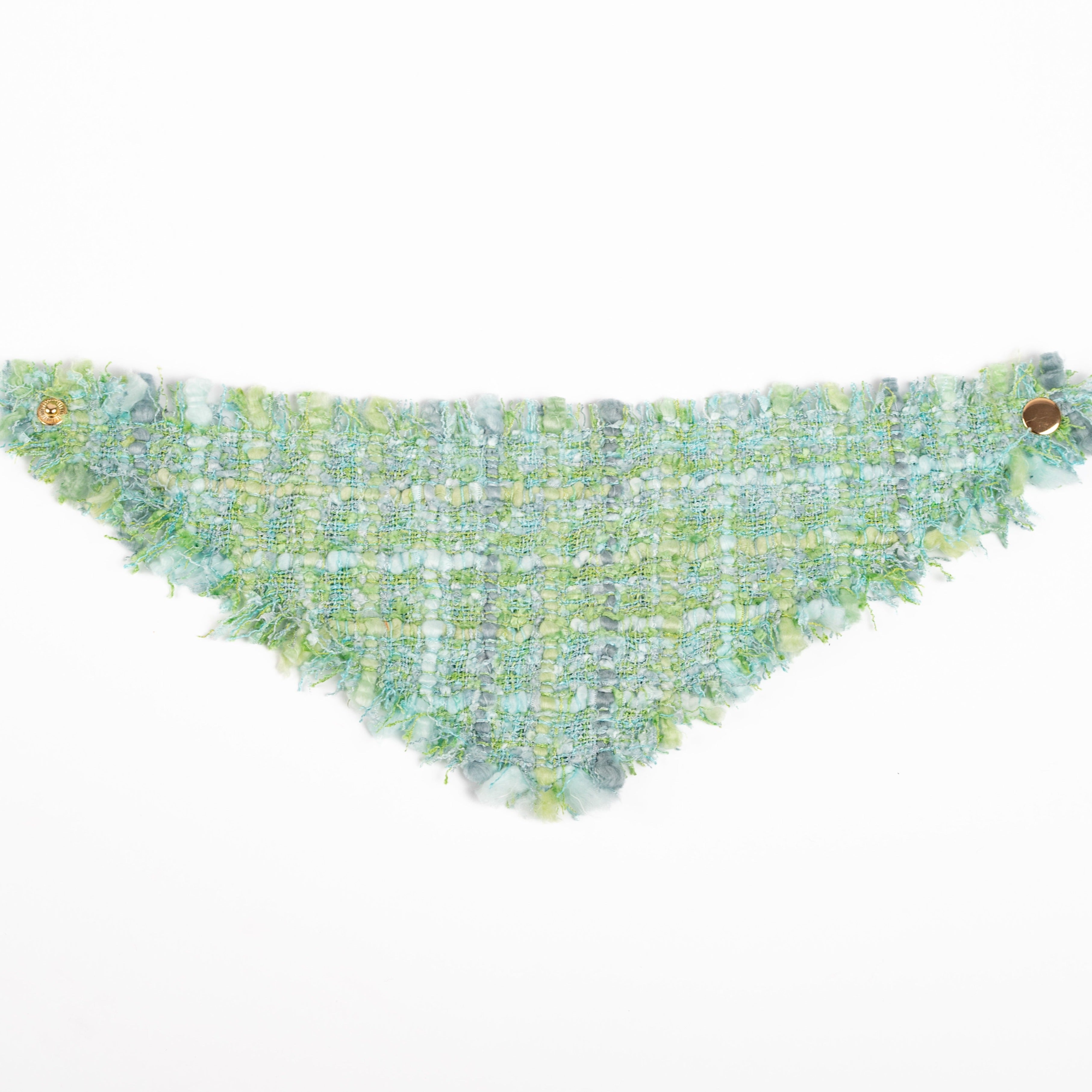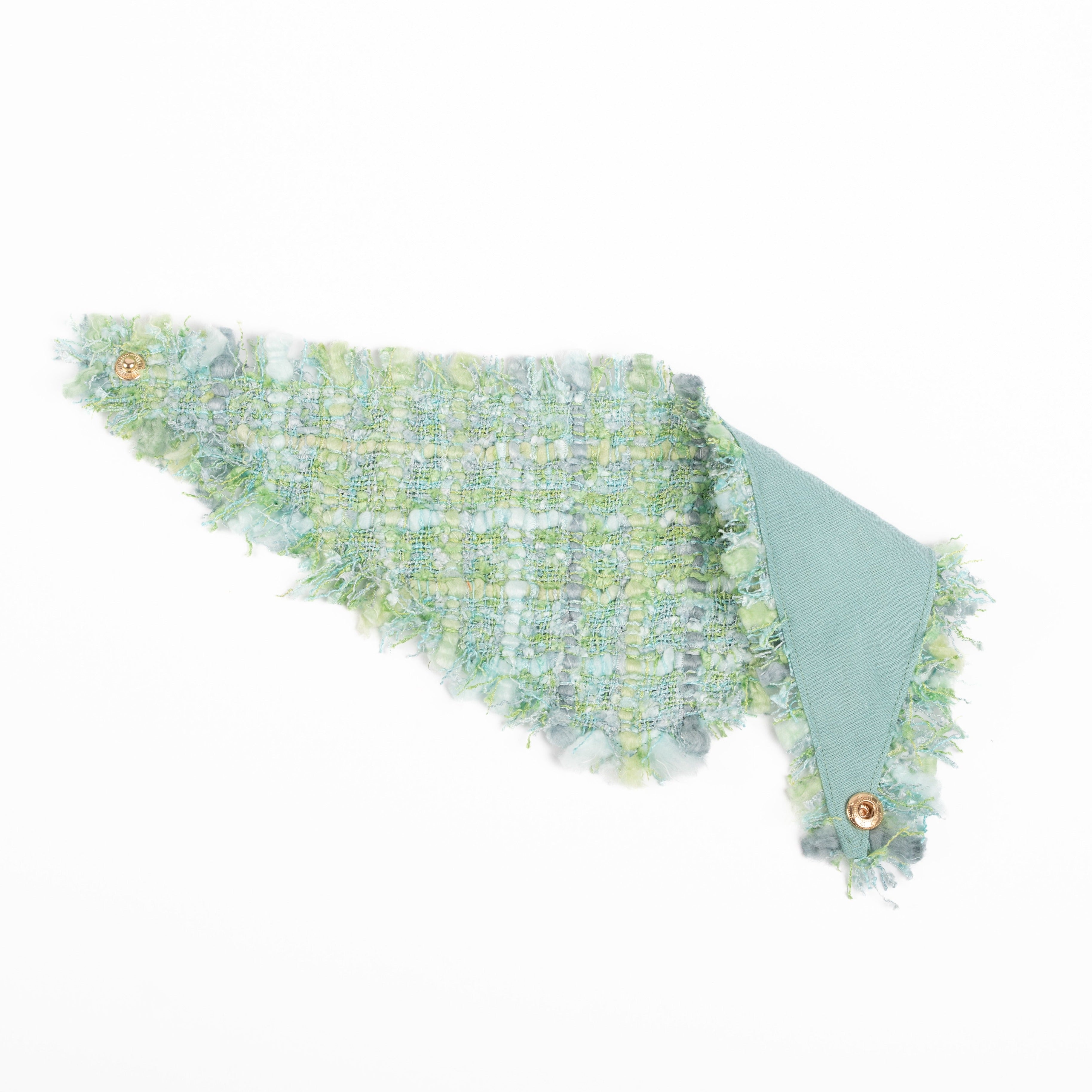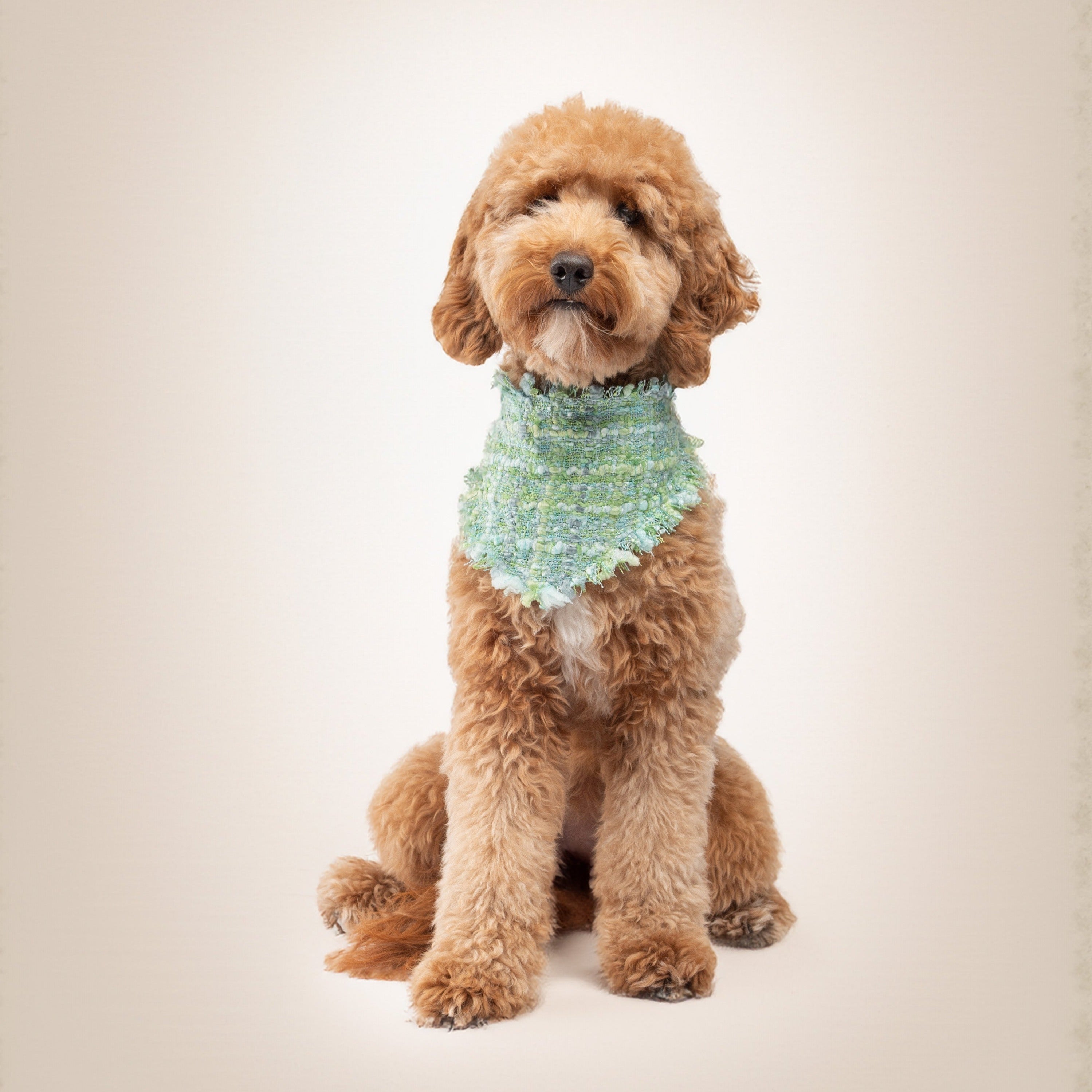 Our Goldsnap dogs are channeling Coco Chanel in this gorgeous green tweed. Backed in a sustainable linen/tencel blend for durability and softness, the scarf features hand frayed edges as a unique design detail.